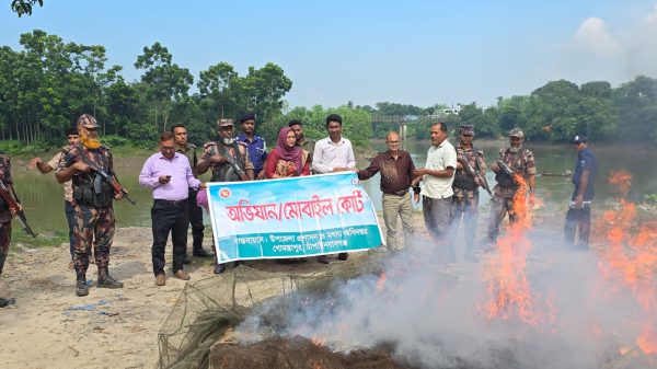 গোমস্তাপুরে পুনর্ভবা নদীতে অভিযান পরিচালনা অবৈধ জাল ধ্বংস