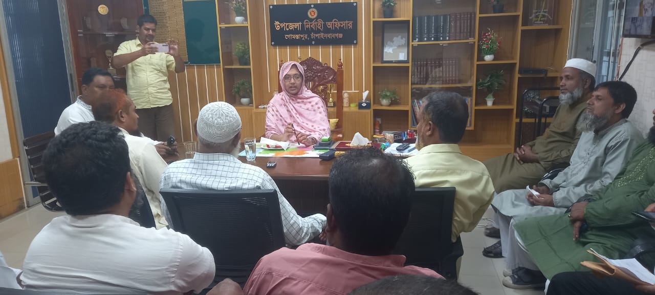 চাঁপাইনবাবগঞ্জের গোমস্তাপুরে বর্তমান বাজার পরিস্থিতি নিয়ে রাজনৈতিক নেতৃবৃন্দ, জনপ্রতিনিধি,ব্যবসায়ি নেতা ও গণমাধ্যম কর্মীদের সাথে মতবিনিময় করেছেন ইউএনও নিশাত আনজুম অনন্যা।বুধবার (১৬ অক্টোবর) সকালে তার কার্যালয়ে আয়োজিত এ মতবিনিময় সভায় উপস্থিত ছিলেন উপজেলা বিএনপির আহবায়ক বাইরুল ইসলাম,রহনপুর পৌর বিএনপির আহবায়ক এনায়েত করিম তোকি,বিএনপি নেতা আসাদুল্লাহ আহমদ, বিএনপি নেতা তারিক আহমেদ , জামায়াত নেতা মিজানুর রহমান, শাহ আলম,তরিকুল ইসলাম বকুল, মনিরুজ্জামান ডাবলু ও ইমামুল হুদা, পার্বতীপুর ইউপি চেয়ারম্যান মোয়াজ্জেম হোসেন, ব্যবসায়ি নেতা মাসুদ রানা, আবদুল হালিম, সবজি আড়তদার শাকিল আহমেদ ও আঃ রহিম, ব্যবসায়ি মোতালেব হোসেন ও শফিকুল ইসলাম কালু , সাংবাদিক আতিকুল ইসলাম আজম, নাহিদ ইসলাম, সামিরুল ইসলাম আলাউদ্দিন পারভেজ সহ অন্যরা। সভায় বর্তমানে হাটবাজারে সবজিসহ নিত্য প্রয়োজনীয় দ্রব্য সামগ্রীর দাম বৃদ্ধি পাওয়ায় তা নিয়ন্ত্রণে মনিটরিং কার্যক্রম অব্যহত রাখতে সকলের সহায়তা কামনা করা হয়।